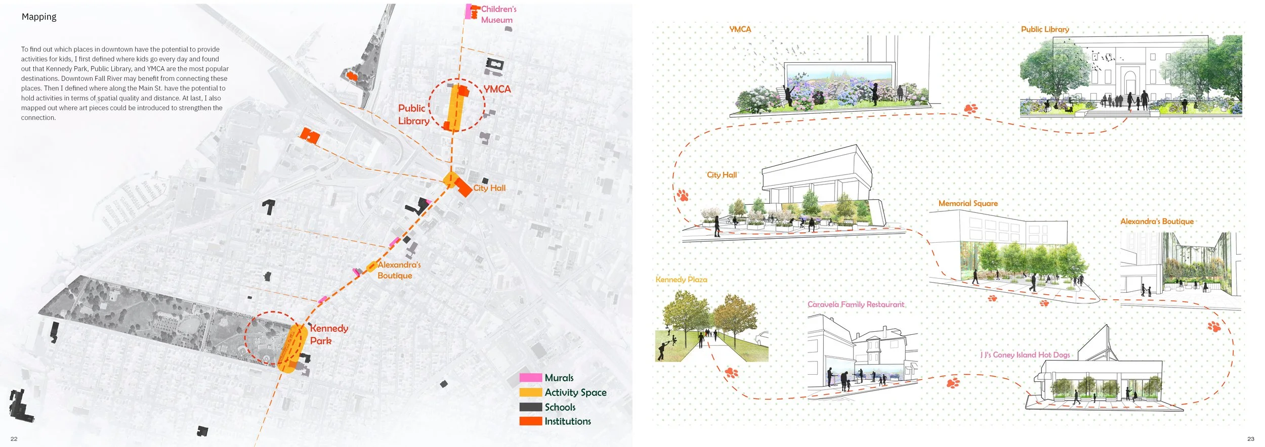 In the first phase, students as groups organize public engagement events to gather information and advice about Downtown Fall River from the public. In the next stage, each student works individually to develop a pop-up proposal to revitalize downtown. Based on feedback from previous events, I choose kids living in Fall River as my target and propose a hybrid reality treasure-hunting game as my pop-up design. This game includes a mascot as the character, pocket green spaces as the game’s site, and a treasure-locating system as the game rules. In this way, I aim to cultivate people rethinking about the streetscape and hope this game could be the beginning of a kid-friendly downtown Fall River in the future.